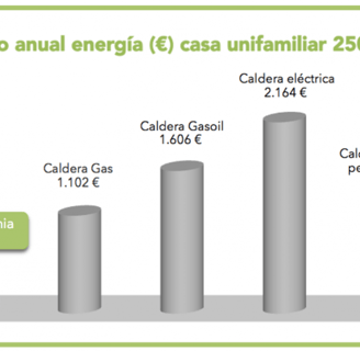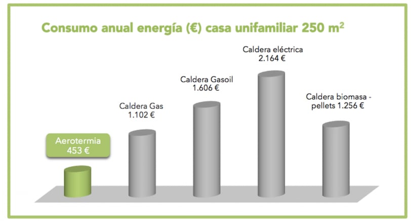 Con aerotermia: Instalando una bomba de calor con un COP de 4, la demanda energética anual de 15.000 kWh se reduciría a un consumo eléctrico de 3.750 kWh. Con un precio medio de la electricidad de 0,15 €/kWh, el coste sería de 562,50 € al año, lo que supone un ahorro de más de 1.400 € al año.
